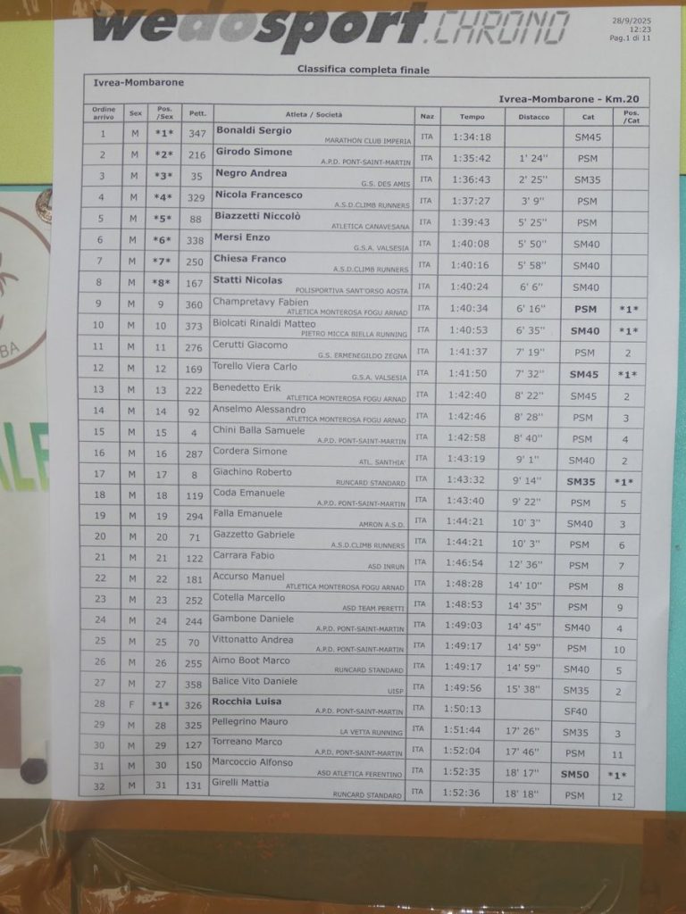 Per Sergio Bonaldi, bergamasco tesserato per il Marathon Imperia, successo in 1h34’18”, ottimo secondo posto per Simone Girodo in 1h35’42”, Andrea Negro completa il podio in 1h36’43”. Top 10 di livello nell’ordine con Francesco Nicola, Niccolò Biazzetti, Enzo Mersi, Franco Chiesa, Nicolas Statti, Fabien Champretavy e Matteo Biolcati Rinaldi.