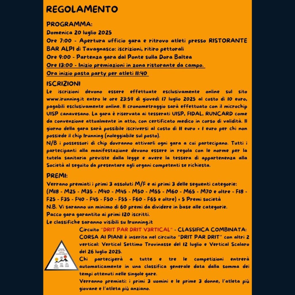 Dall’anno scorso la gara è inserita in un circuito Drit par Drit V3rtical, cioè la combinata per somma dei tempi con le gare Settimo Vittone – Trovinasse, corsa sabato scorso e la Quincinetto – Scalaro di sabato 26 luglio prossimo, tutte e 3 gare con circa 1000 metri di dislivello al 20%.