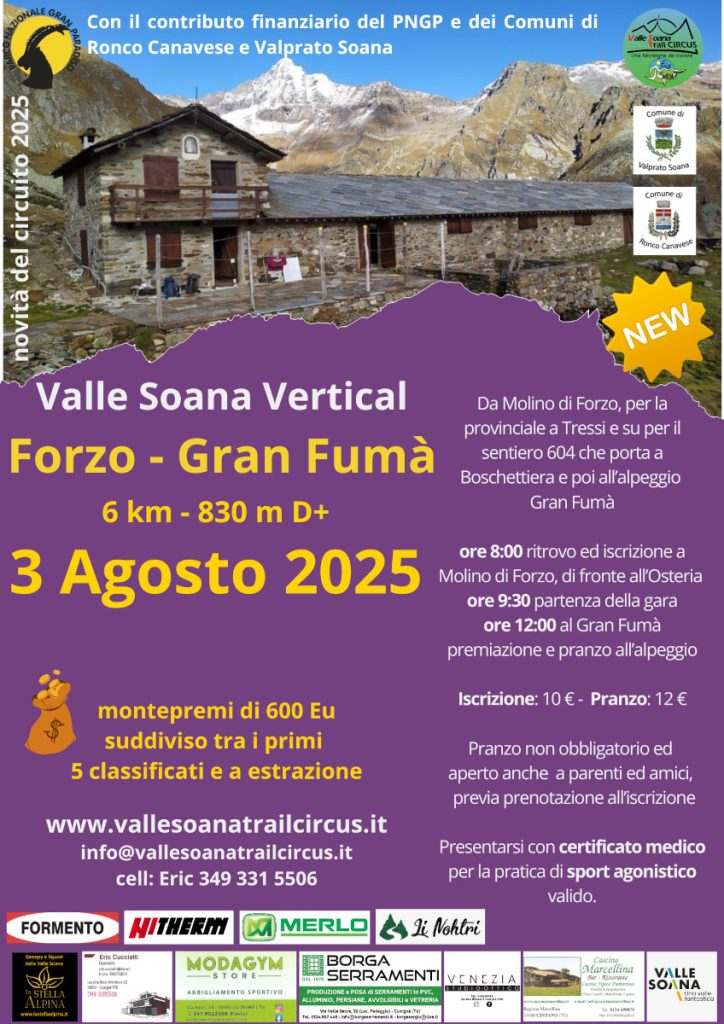 • Forzo – Gran Fumà (3 Agosto 2025): Una prova di 6 km con 830 m di dislivello positivo, un percorso inedito che si snoderà tra le bellezze della Valle Soana.